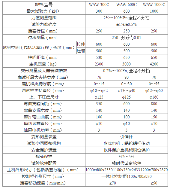 1.WAW-300C/600C/1000C型微機(jī)控制電液伺服萬(wàn)能試驗(yàn)機(jī),采用油缸下置式主機(jī),拉伸空間位于主機(jī)的上方,壓縮彎曲試驗(yàn)空間位于主機(jī)下橫梁和工作臺(tái)之間油缸活塞采用間隙密封經(jīng)久耐用