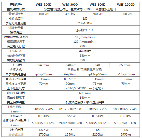 濟(jì)南試金WES-D數(shù)顯式液壓萬能試驗(yàn)機(jī)主要用于金屬材料的拉伸、壓縮、彎曲等力學(xué)性能試驗(yàn),增加簡單的附件后可對水泥、混凝土、磚、瓦、橡膠及其制品進(jìn)行檢測。