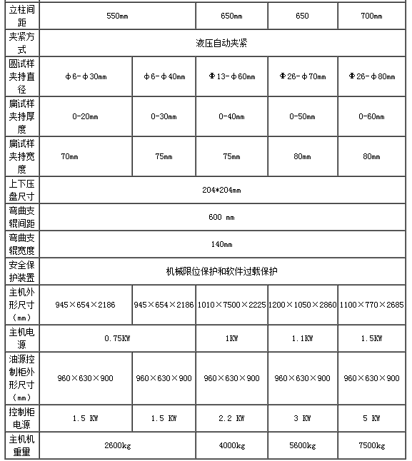 本機由四立柱雙絲杠油缸下置式高強度主機及琴式油源控制柜組成,油泵采用意大利馬祖奇進口低噪音高性能齒輪泵。拉伸空間位于主機上方,壓縮、彎曲試驗位于主機下方即中橫梁和工作臺之間。試驗空間的調整通過移動中橫梁來實現,中橫梁升降采用鏈條傳動。計算機全自動閉環控制高性能電液比例伺服閥來完成對各種材料的拉伸、壓縮、彎曲等試驗。試驗完成以后自動采取材料的FM、REH、REL、RPO.2、RP1、RM和彈性模量E等實驗結果。