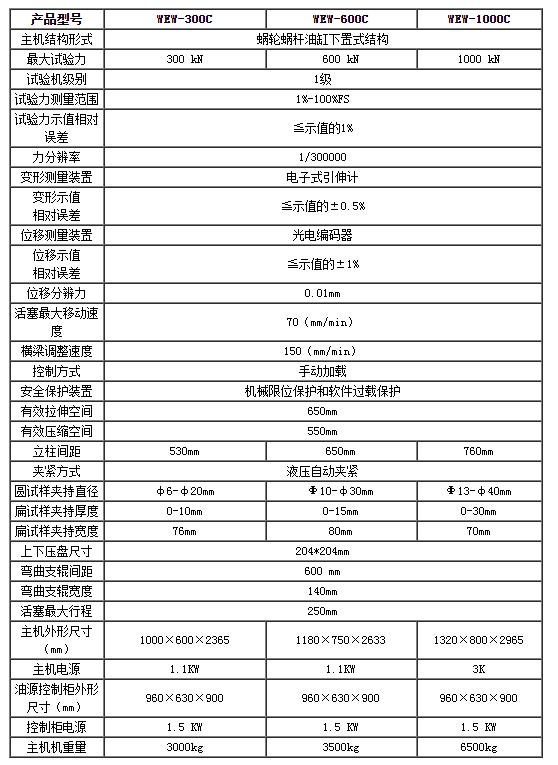 主要用途濟南試金WEW-C系列微機屏顯式液壓萬能試驗機主要用于金屬材料的拉伸、壓縮、彎曲等力學性能試驗,增加簡單的附件后可對水泥、混凝土、磚、瓦、橡膠及其制品進行檢測。 本機由蝸輪蝸桿下置式主機及琴式油源控制柜組成,油泵采用意大利馬祖奇進口低噪音高性能齒輪泵。拉伸空間位于主機上方,壓縮、彎曲試