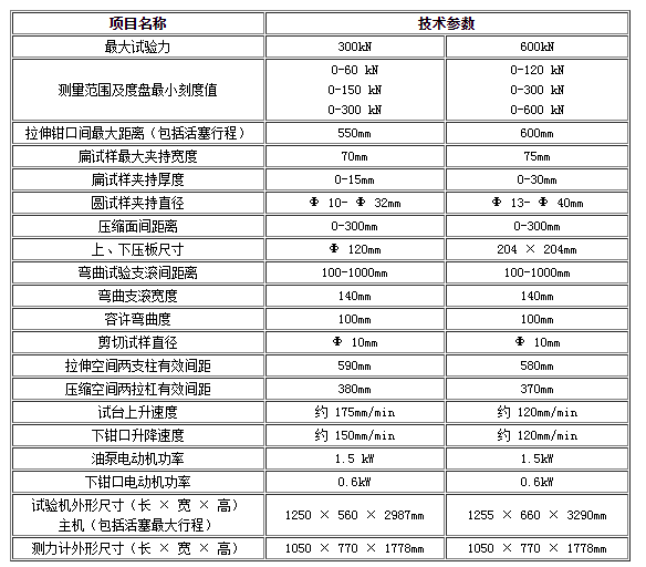 ●WE-300/600型液壓式萬能試驗機主要技術規格及參數: